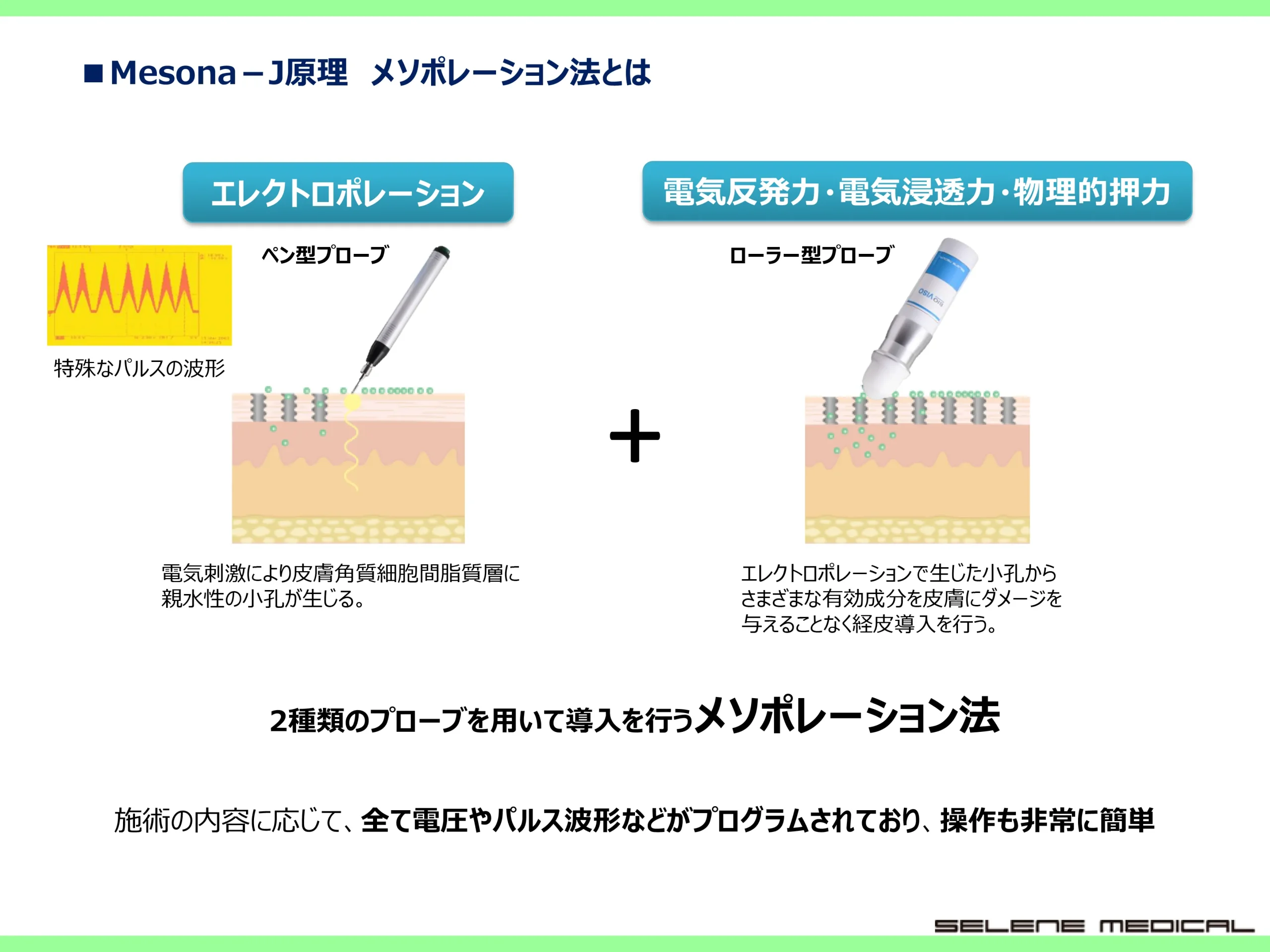 ペン型とローラー型の2つのプローブを使って有効成分を「経皮導入」する。これが、メソナJのメソポレーション法です。